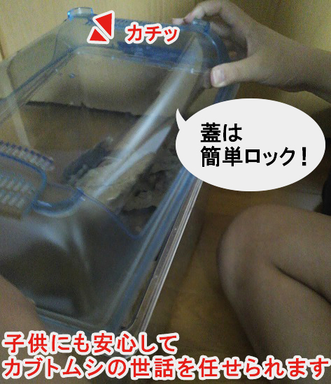 蓋は、カブトムシが自力では空けにくいスライド式。ロック機能が付いているので、カブトムシの脱走もしっかり防げます。